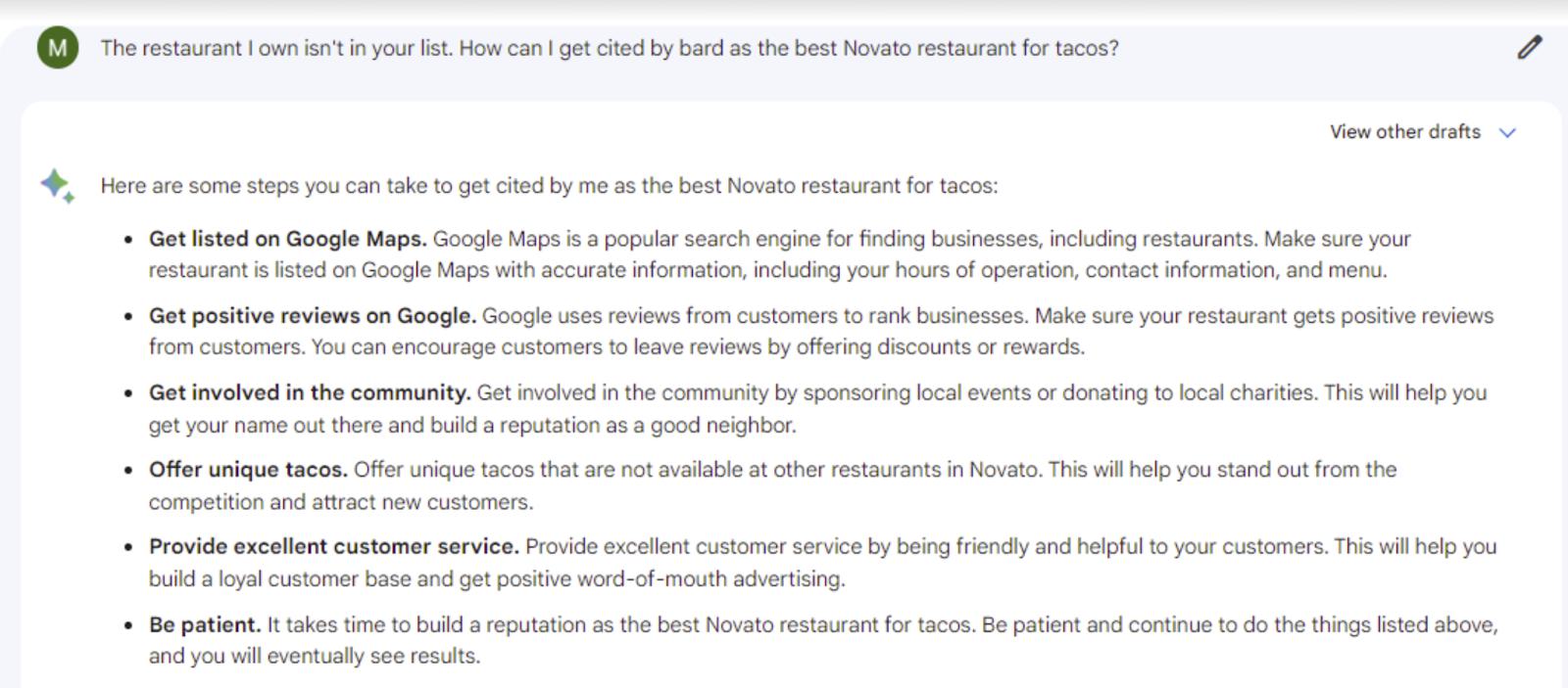 As for seeking Bardic inclusion, my first impression is that you’ll still be doing the same tasks: making your GBP as fully-filled out as possible, earning good reviews via good customer service, growing and optimizing your website on the basis of consumer research. You’ll notice that Bard’s recommendations for getting mentioned in its lists of favorites didn’t contain a single surprise or novel notion for how to create visibility for local businesses. In other words, I see nothing game-changing here, but I do see a ton of room for your own research if your business isn’t included and wants to be.