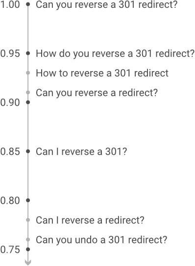 You can see visually how the similarity of the results diverges as you change and remove certain keywords, and how this creates a complex interaction. What’s fascinating to me is that changing the question phrase from “Can you” to “How do you” or “How to” made very little difference in this case, while removing either “301” or “redirect” had more impact. Switching “you” vs. “I” by itself was fairly low impact, but was additive with other changes. Even the SERPs with “undo” in place of “reverse” showed fairly high similarity, but this change showed the most impact.