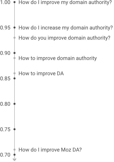 Here’s another example, based on the question “How do I improve my domain authority?”. As above, I’ve charted the RBOLite similarity scores between the main phrase and variations. In this case, the week-over-week score was 0.83, suggesting some background flux in the keyword space:
