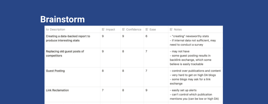After my brainstorm, I came up with 11 backlink building tactics and a few ideas about how I’d approach each tactic. To help narrow things down, I assigned an impact, confidence, and ease (ICE) score for each. This means rating each idea on the three areas, from 1-10: