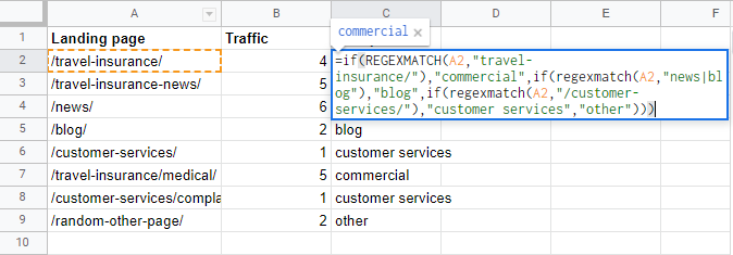 =if(REGEXMATCH(A2,"travel-insurance/"),"commercial",if(regexmatch(A2,"news|blog"),"blog",if(regexmatch(A2,"/customer-services/"),"customer services","other")))