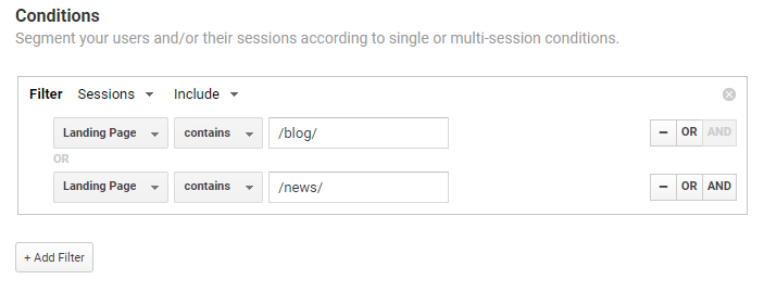 If you have both sections, then you can lump these together by using the “OR” function of the filter. This will then show you all of the data based on landing pages that contained either the /blog/ or /news/ in the hierarchy.