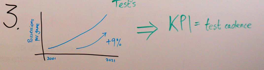 And then the final piece of the strategic puzzle here is that you drive your test cadence up. So the basketball equivalent, again, is that over this same time period possessions per game are up almost 10% over that time. And the reason for that is that if you have an edge, if you have an advantage over your opponents, which is exactly what this kind of advanced insight gives you, you want more goes.