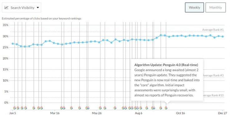 See a dramatic change in your rankings overnight? We now leverage the great data from MozCast to show any Google algorithm changes that might be affecting your search presence. Just hover over the little Google "G" to see major and minor update details.
