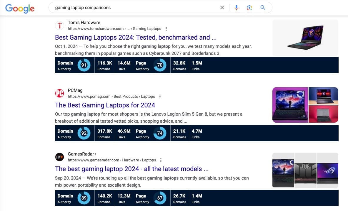 Despite the launch of AI overviews- a catalog of rich features that have converted SERPs to a collection of boxes reminiscent of a child’s scrapbook–link metrics are still accessible for all organic listings. Access Domain Authority, Page Authority, Linking Domains, and Inbound Links for all organic listings with any search on Google.