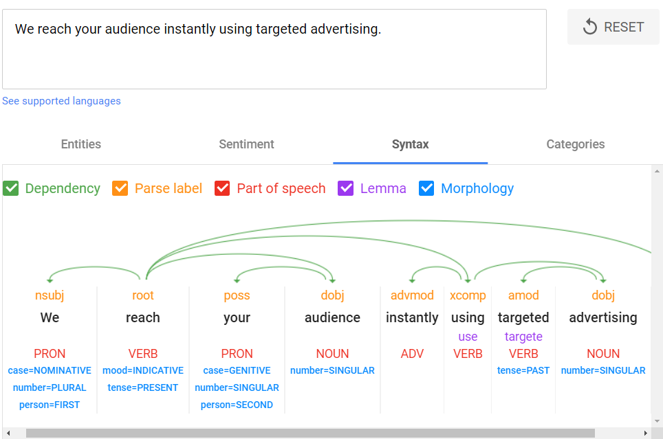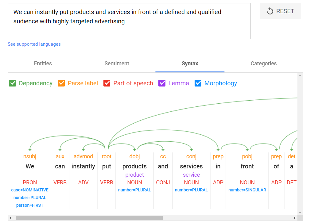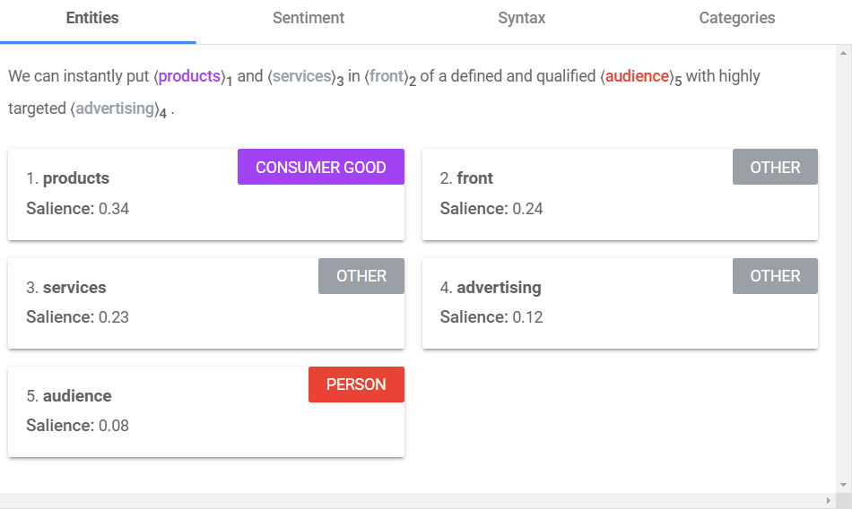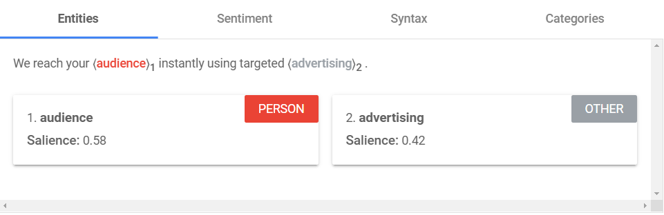 You can instantly see the dependency “hops” reduce. And the overall result is a sentence that retains meaning, while the most salient entities “audience” and “advertising” have a much higher salience score showing they are understood as more important or central to the text: