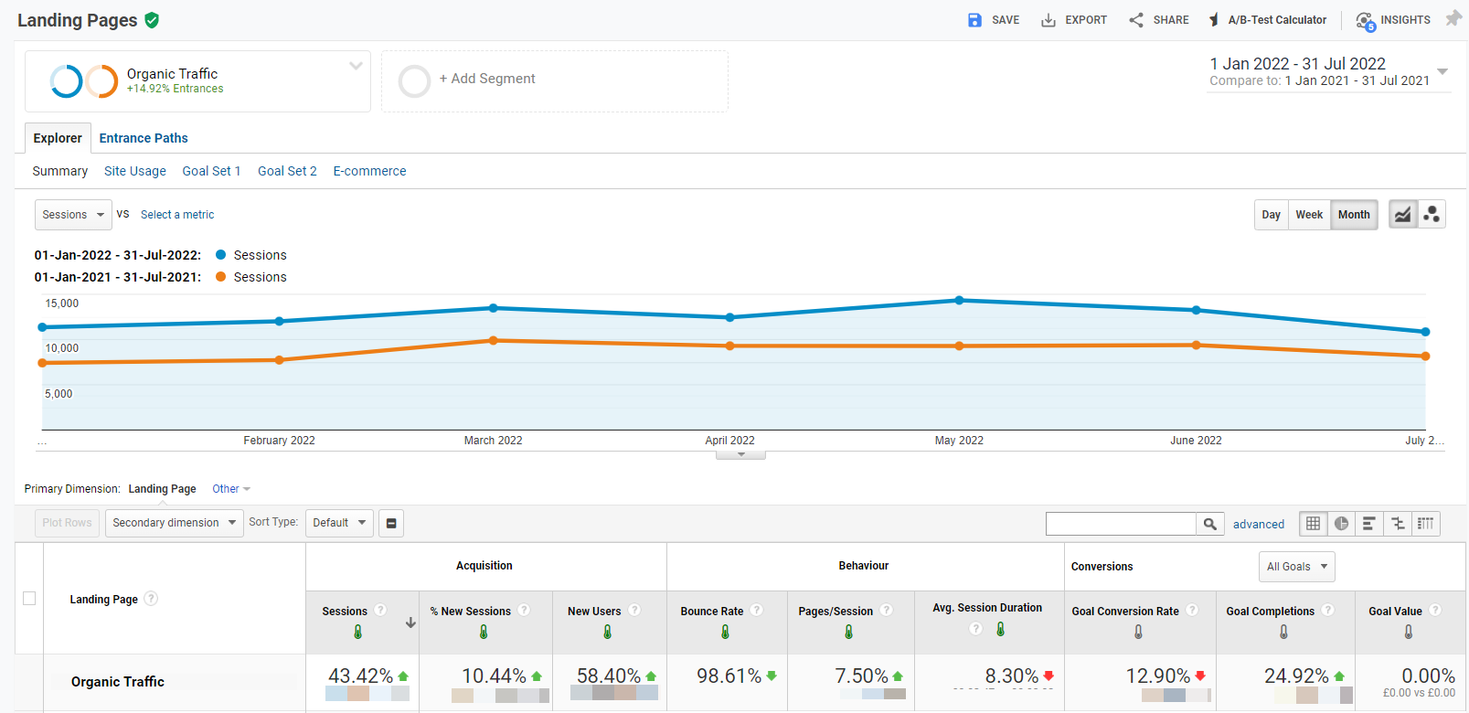 Working on all of the above with a technical client across their blog content has yielded a 43.42% increase in organic traffic landing on blog pages, and a 24.92% increase in goal completions so far in 2022: