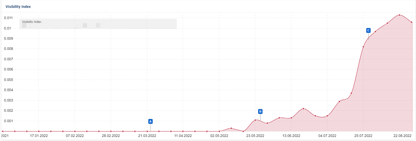 Here’s an example of a specific content piece that was published in January, and saw virtually no visibility for just over three months. Things started to take hold and really ramp up after the May core update (marker B) with no significant changes made to the content.
