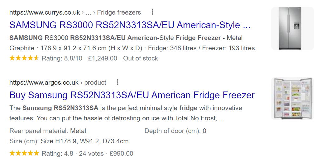 For example, the below image shows product search results for UK retailers Currys and Argos displaying prices, images, and review ratings: