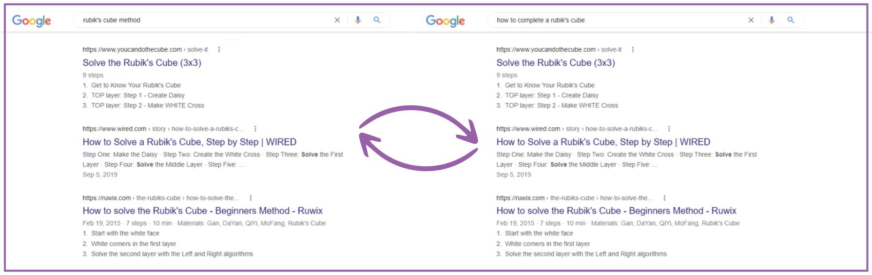 Without looking at the SERPs, one might be tempted to assign “Rubik’s Cube method” as a focus keyword for an article that shares different methods, whereas “‘how to complete a Rubik’s Cube” would be a step-by-step guide. Thankfully, Google SERPs is quite clear that these two keywords can be used—and should be used—on the same web page to avoid cannibalization and poor performing articles because they simply don’t cover the topics in full.