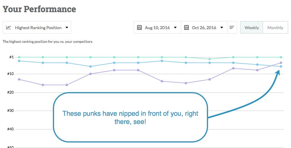 Tracking your rankings is crucial to understanding why you’re not performing as well as you expected. If you’re seeing a lot of down arrows, you need to investigate who is jumping ahead of you and why.