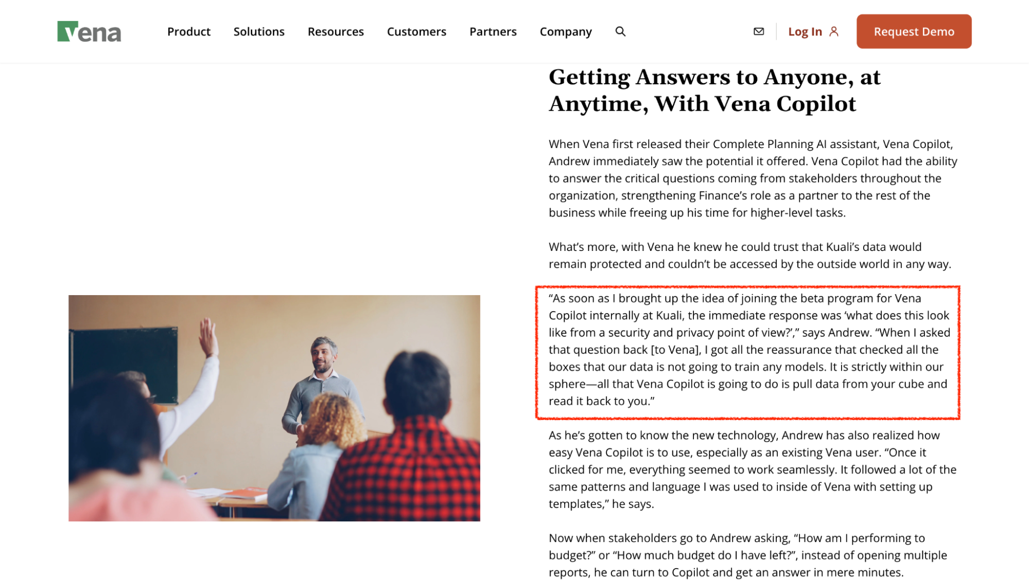 For example, in a Vena customer story, Andrew, Finance Manager at Kuali Inc., shared how his team raised security concerns when he proposed joining the Vena Copilot beta. Vena had answers ready, making it easy to reassure his team and get approval.