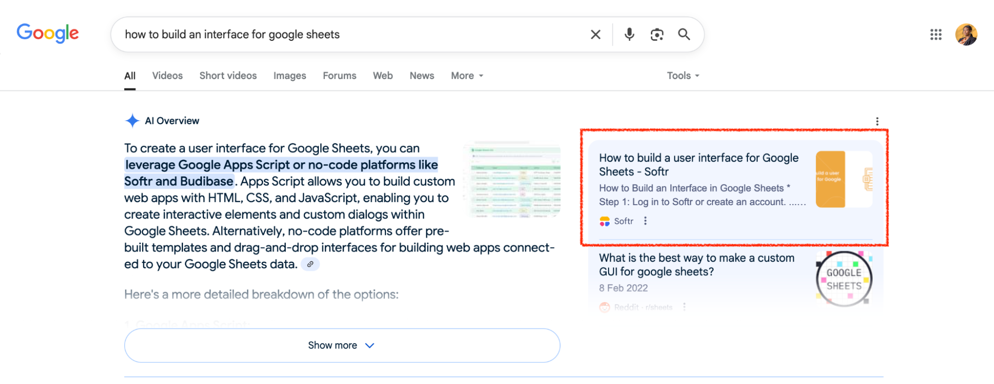 Within days of publishing, the article drove signups and ranked for high-intent keywords like “how to build an interface for Google Sheets.”