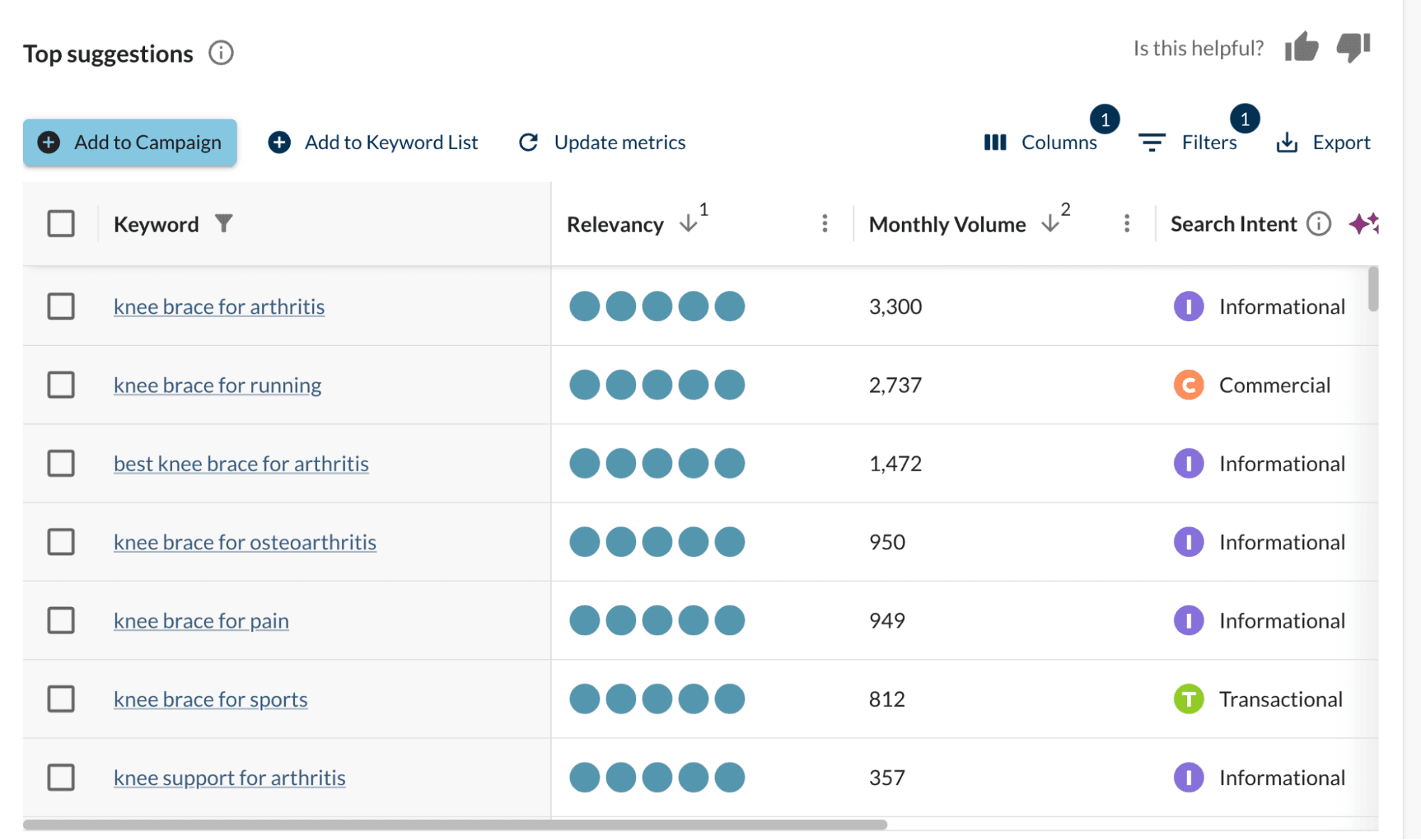For example, the filtered result shows many informational keywords related to customers' pain points when searching for knee braces. Add these to your keyword list.