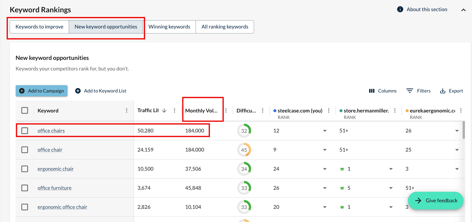 On the results page, scroll down to keyword rankings data and review the highest volume keywords under keywords to improve and new keyword opportunities.
