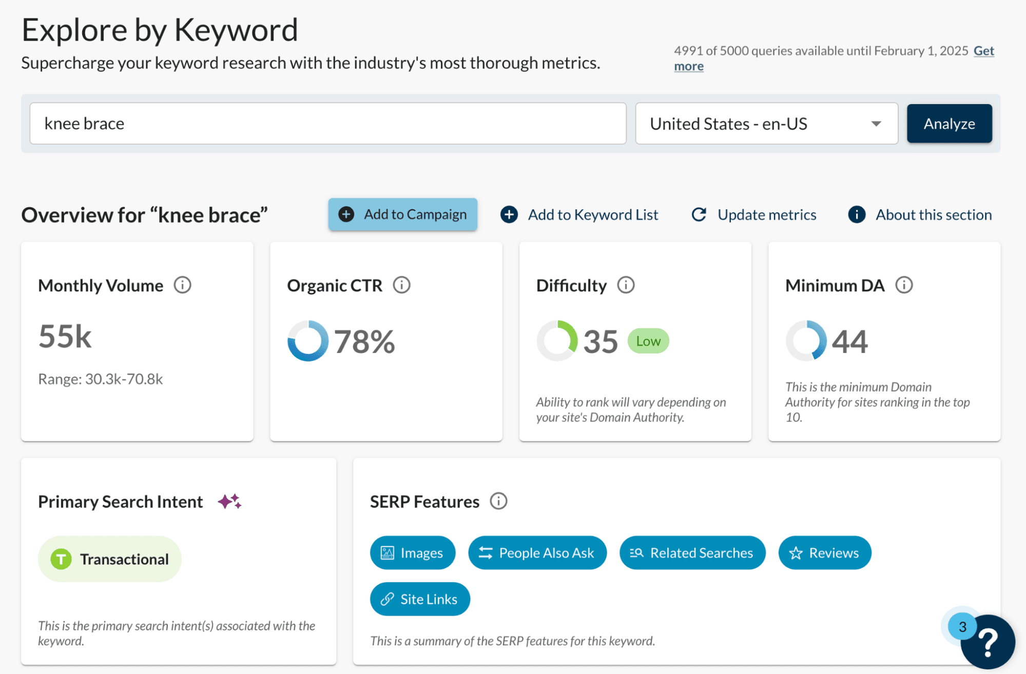 First, enter your seed keyword in Keyword Explorer. For this example, I’ve chosen “knee brace.”