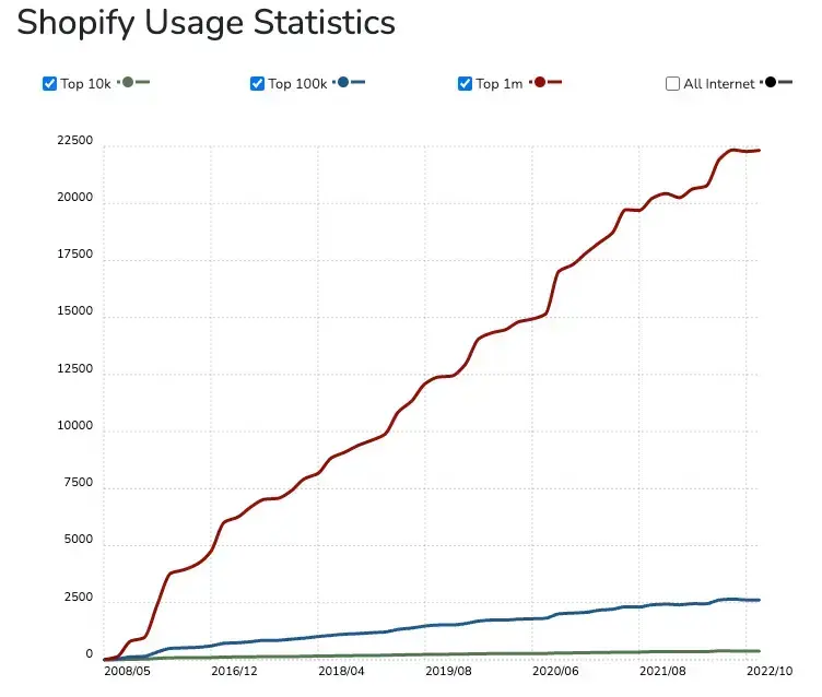 The Shopify platform has been steadily rising in popularity throughout the years. Looking at BuiltWith usage statistics, we can see that usage of the CMS has more than doubled since October 2017. Currently, 4.24 of the top 10,000 sites and 3.02% of the top 100,000 are using Shopify.