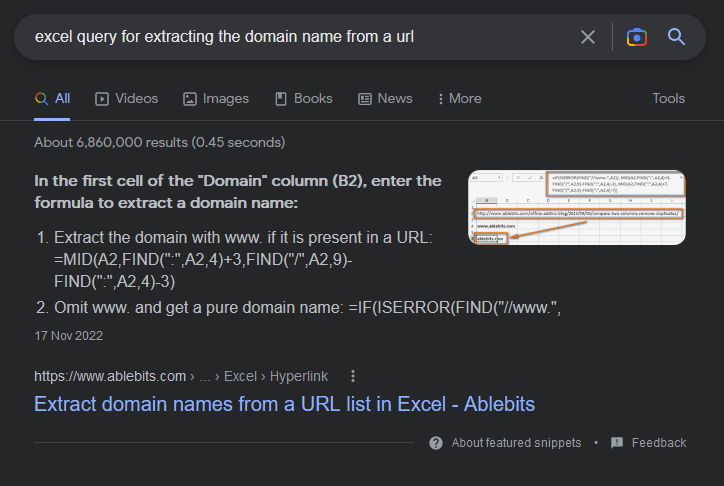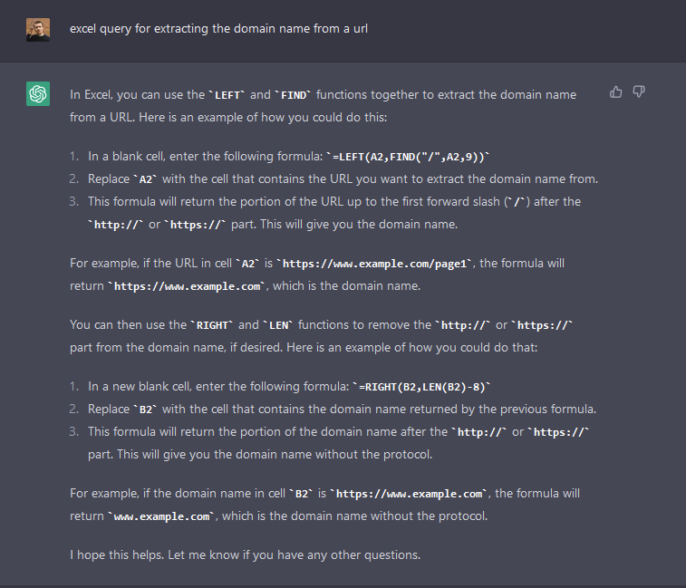 Then of course, most recently, SEOs of Twitter have been right to point out that for many queries, ChatGPT produces better responses than Google. Take this example, “excel query for extraction the domain name from a url”: