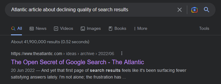 So you have to be willing to abandon the premise that your result should be a web page. Which, in this context, comes down to: do you trust an answer if you don’t know who wrote it? ChatGPT and similar technologies have access to “knowledge” sourced from the web, like Google, but they don’t cite a source. Indeed, it would be immensely difficult to trace the source of their various claims, some of which seem quite… odd.