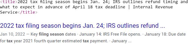No one is doing anything wrong here — the IRS’s <title> is accurate and descriptive, but Google ran out of space. They didn’t take any liberties with the text.