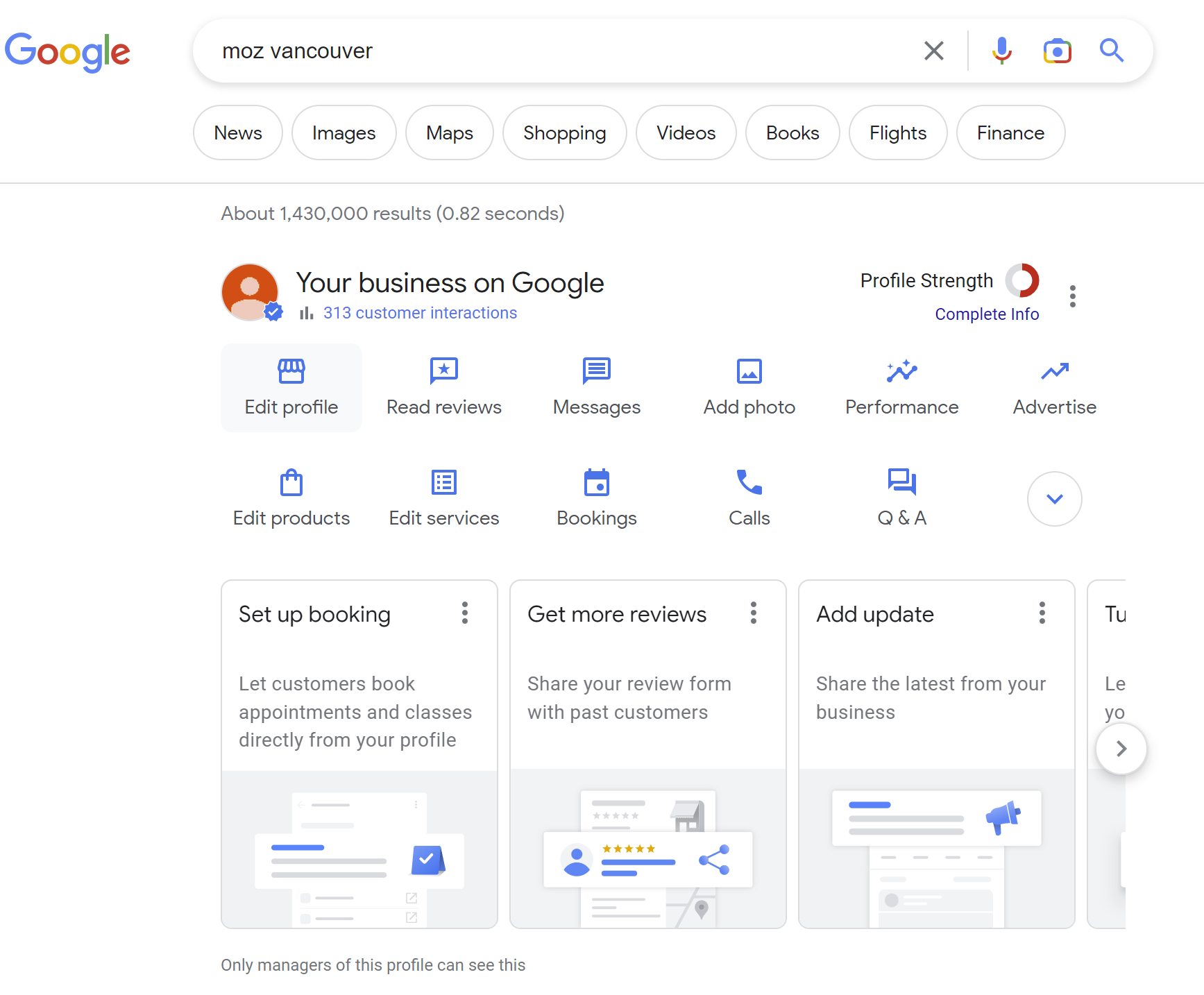 It’s a local search fact of life that you can’t rank for your most important search phrases unless you’ve selected the right GBP category, and the primary category matters most. Usually, Google displays the primary category on your Google Business Profile (see “Italian restaurant”, above), but not always. You select your primary category by logging into your Google account, searching for your business by name, and then clicking on the Edit Profile tab in the New Merchant Experience editor: