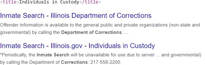 The first result appeared on a search for “department of corrections,” and the second result on a search for “prison inmate search.” While this seems interesting at first glance, these results were collected across two different locations (and probably two different data centers). When I attempted to reproduce this difference from a single location, I only got back a single (rewritten) display title.