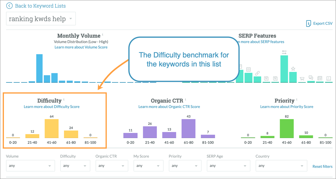 - Compare the Difficulty of keywords you’re already ranking for with the Difficulty of keywords and lists you want to rank for