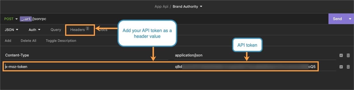 The token generated during sign-up simplifies the authentication process to access Moz API. When structuring your request, all you need to do is add your token as a header value with the key `x-moz-token`.