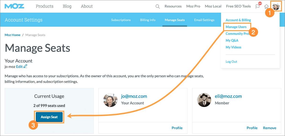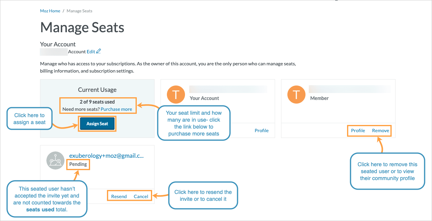 You can share account access to your Moz Pro subscription with coworkers without dishing out your super secret password details by adding them as a Shared User, this is also called a Seat. You can give shared access to anyone, however they will need to set up a free Moz Community account with the email you have shared access with in order to access the subscription.
