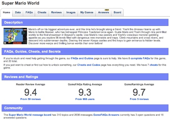 This figure shows a less search engine–friendly example of a content page targeting the term “Super Mario World.” While the subject of the page is present in some of the important elements of the web page (title tag and images), the content is less robust than the Wikipedia example, and the relevant copy on the page is less helpful to a reader.