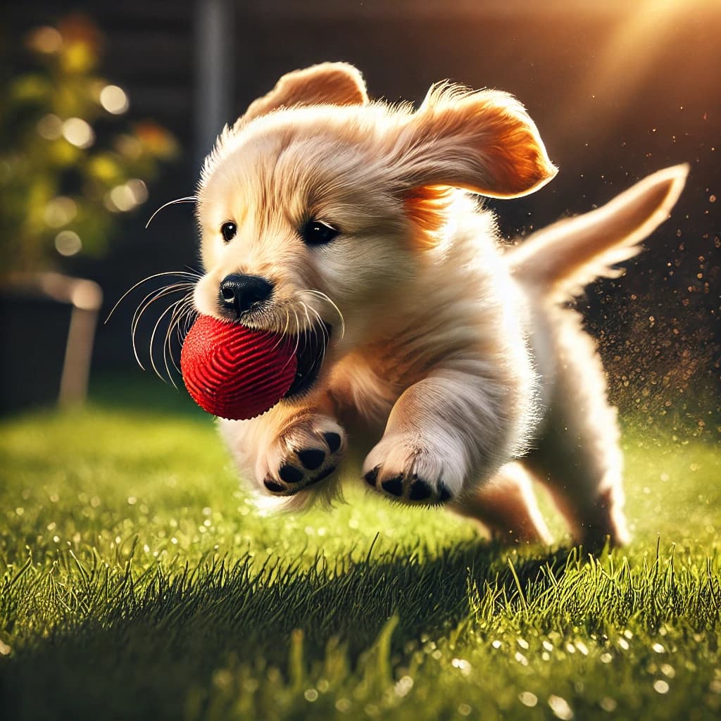 The alt text for this cute image is “Golden retriever puppy playing with a red ball on grass”