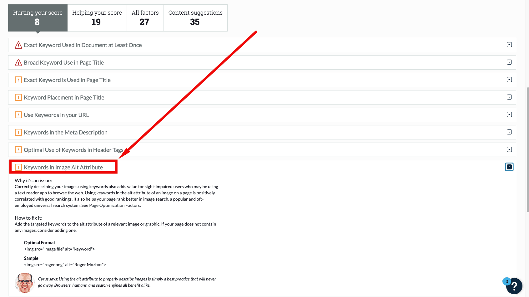 Enter your website URL and the primary keyword for the page. When the result populates, scroll down to view issues hurting on-page SEO like using keywords in alt-text.