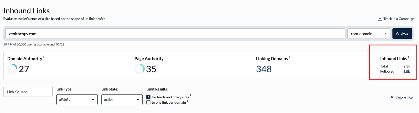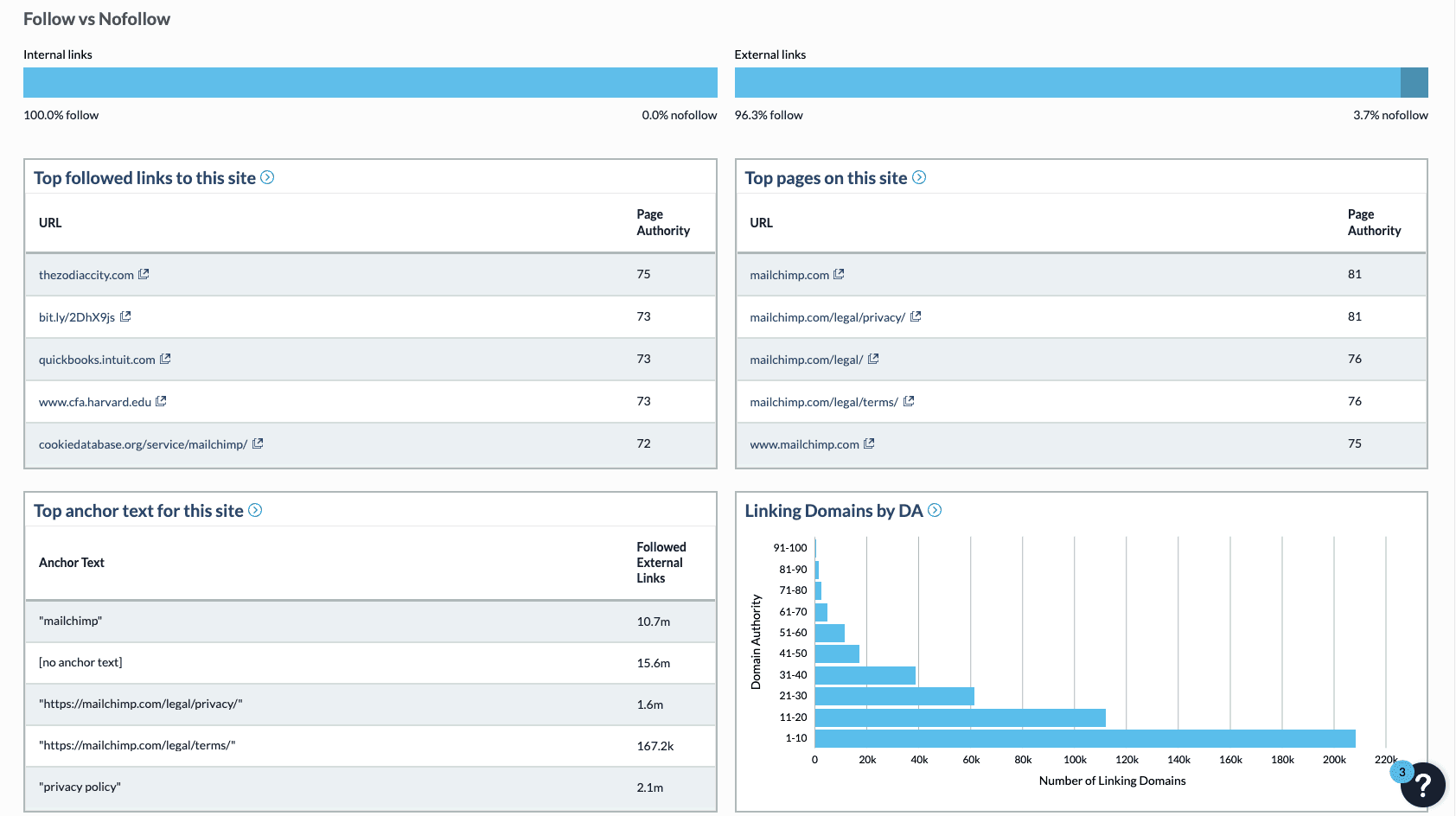 The next page shows your total number of linking domains, inbound links, and how many are dofollow.