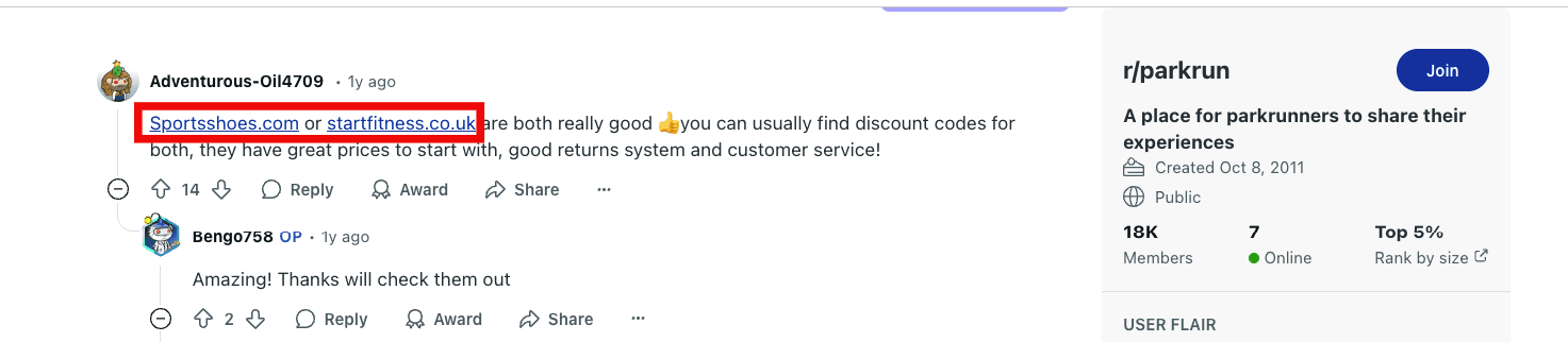 For example, in a forum for park runners, a user asked for recommendations on where to buy running shoes, and someone responded with links to two websites. The websites earn referral traffic that could generate revenue. They also earn brand mention and authority signals from users who see them as trustworthy.