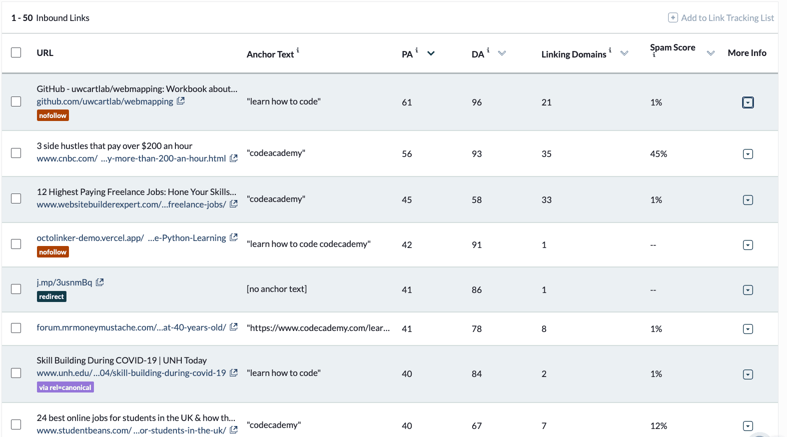 For example, Code Academy is attracting backlinks from authoritative websites like CNBC and GitHub, passing authority to their page.