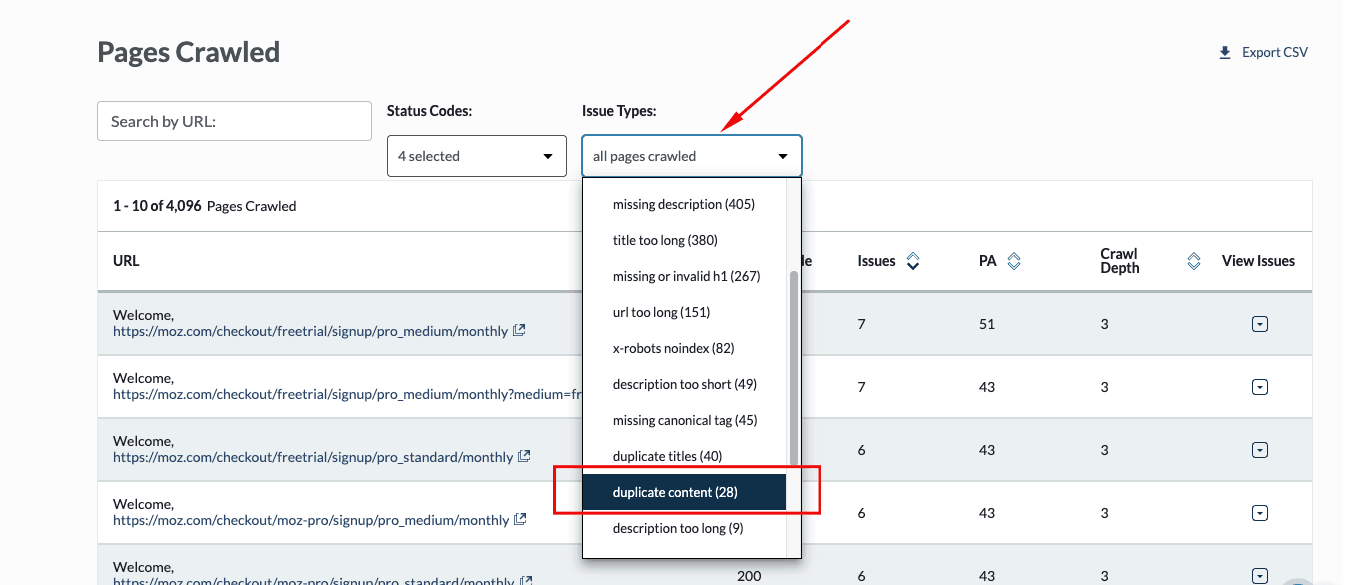 When the crawl is complete, click Crawl Report and scroll down to Pages Crawled. Under Issue Type select duplicate content to view all duplicate pages on your website.
