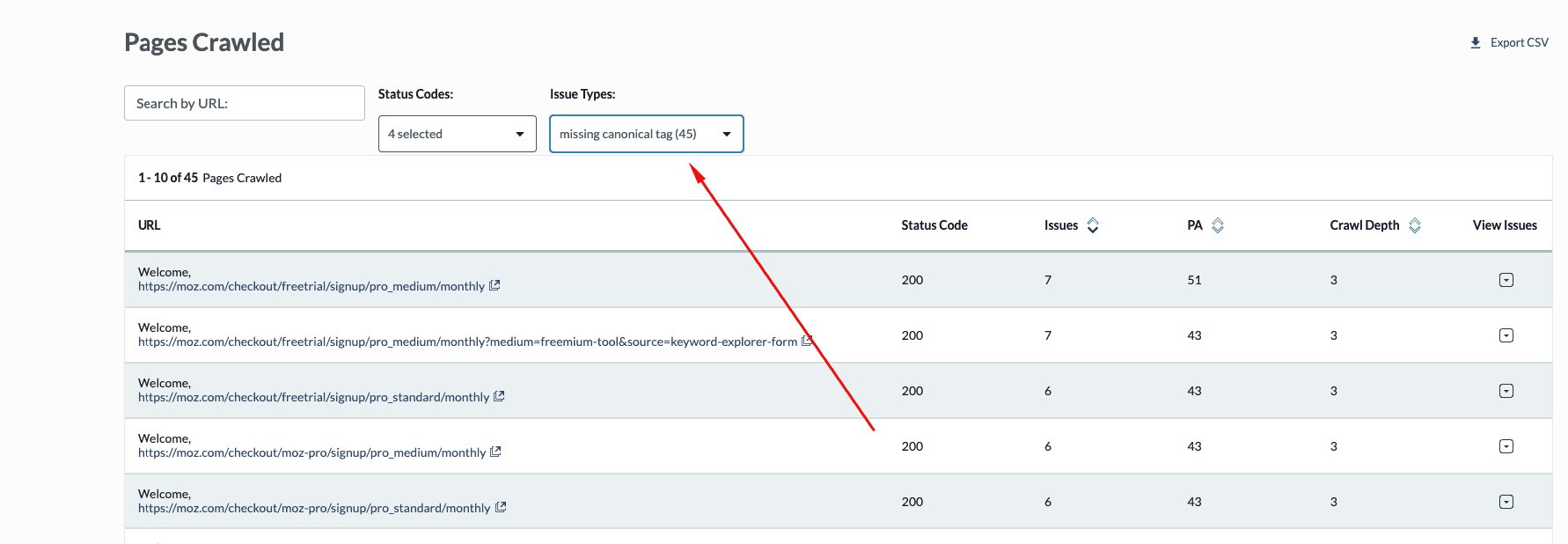 Start by identifying pages that have similar or identical content where a canonical tag would be beneficial. You can find this using the Moz Site Crawl feature.