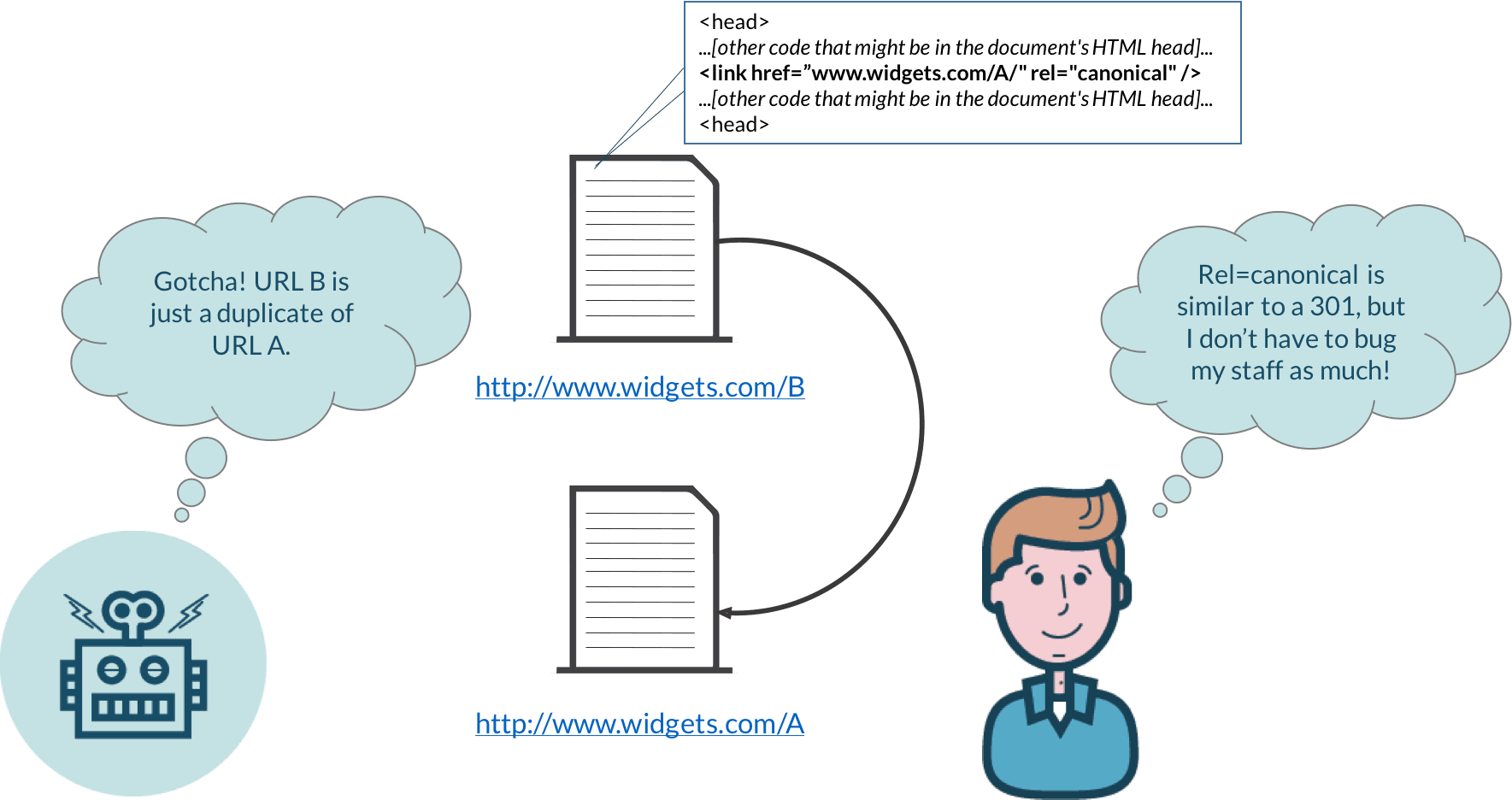 The rel=canonical attribute should be added to the HTML head of each duplicate version of a page, with the "URL OF ORIGINAL PAGE" portion above replaced by a link to the original (canonical) page. (Make sure you keep the quotation marks.) The attribute passes roughly the same amount of link equity (ranking power) as a 301 redirect, and, because it's implemented at the page (instead of server) level, often takes less development time to implement.