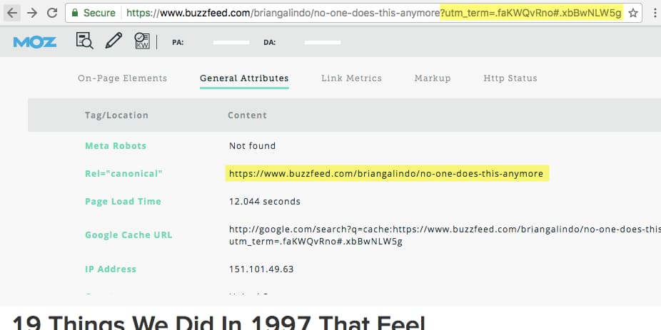 Here, we can see BuzzFeed is using the rel=canonical attributes to accommodate their use of URL parameters (in this case, click tracking). Although this page is accessible by two URLs, the rel=canonical attribute ensures that all link equity and content metrics are awarded to the original page (/no-one-does-this-anymore).