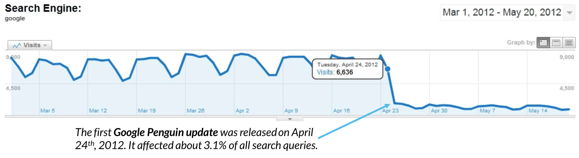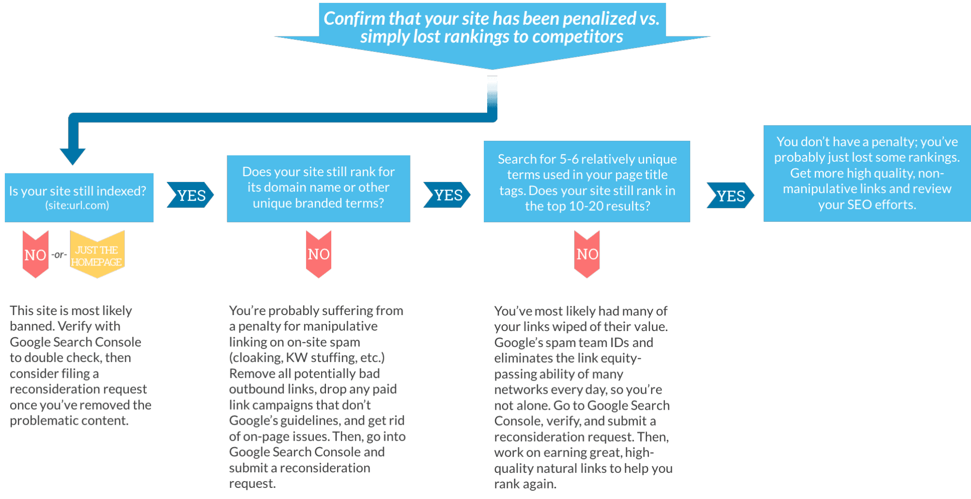 When a known, named update occurs, it’s important to study industry documentation of practices being cited as involved in the update. If your loss of rankings or traffic corresponds with a known date, go through these industry lists of bad practices to discover if they are taking place on your website. Then, if you believe you’ve found a correlation between bad practices and an update, act to remedy the situation.