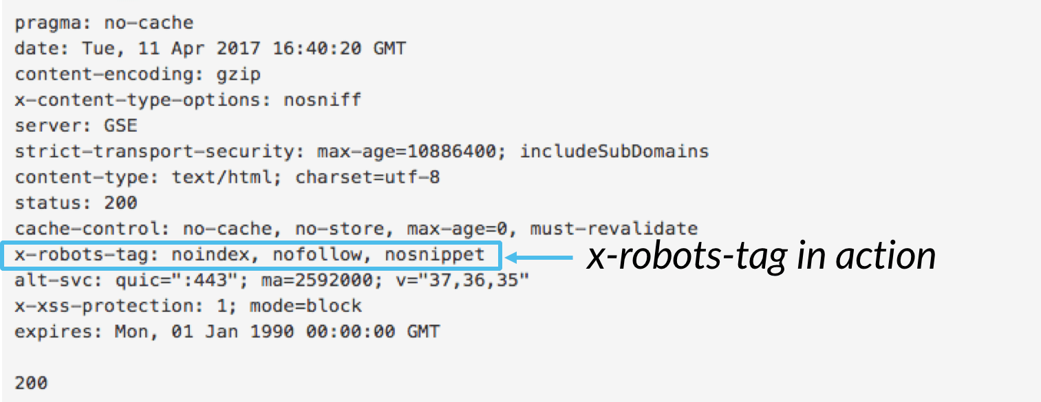 While the meta robots tag allows you to control indexing behavior at the page level, the x-robots-tag can be included as part of the HTTP header to control indexing of a page as a whole, as well as very specific elements of a page.