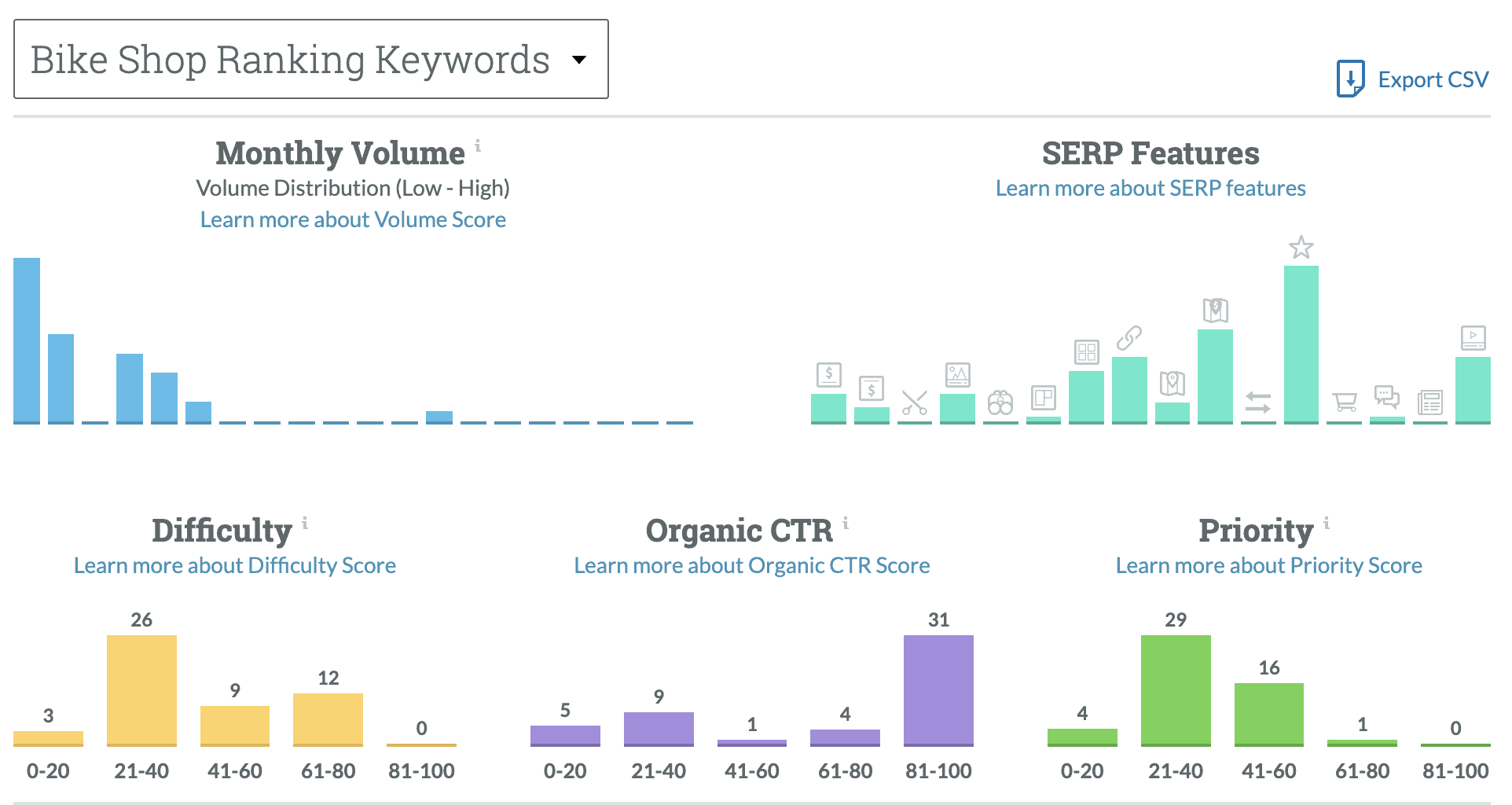 And that’s not all, Keyword Lists in Moz Pro give you a birds-eye view of the keyword metrics in your industry or category. This is the best way to get a high level view of opportunity within a topic or niche.