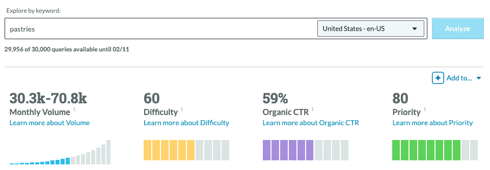 Using Keyword Explorer you’ll be able to easily identify keyword metrics including: Monthly Search Volume, Difficulty, and Organic CTR. You’ll be presented with details on how popular your keyword is and how difficult it is to rank well for it. This is where understanding keyword difficulty becomes crucial. Keyword difficulty is determined by various factors, including search volume and the number of backlinks needed to rank in the top results. Balancing keyword difficulty with potential business value and search intent is essential to optimize your SEO strategies.