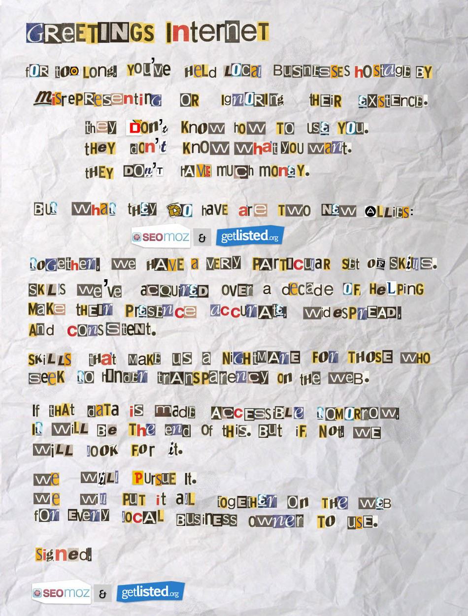 SEATTLE, Wash., Dec. 4, 2012 – SEOmoz, the industry’s most popular provider of search engine and social optimization software, today announced its acquisition of Portland-based software company GetListed.org through a not-quite-anonymous ransom letter mailed from an undisclosed postal drop box located near downtown Seattle. GetListed’s acquisition for around $3 million in cash and stock should come as no surprise to industry folk since SEOmoz CEO, co-founder, and noted vigilante beardo Rand Fishkin declared an acquiring and hiring spree following Moz's funding MEMEnouncement in May 2012.