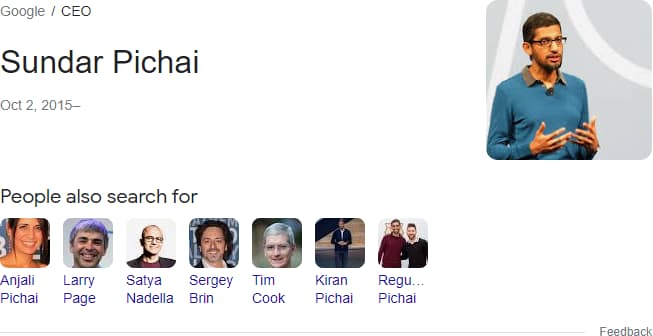 Put simply, the Knowledge Graph is a set of data sources that Google has deemed trustworthy and built a direct pipeline to. Knowledge Graph features take many forms, but let’s focus on just one of them. This is a direct answer on a search for “Who is the CEO of Google?”: