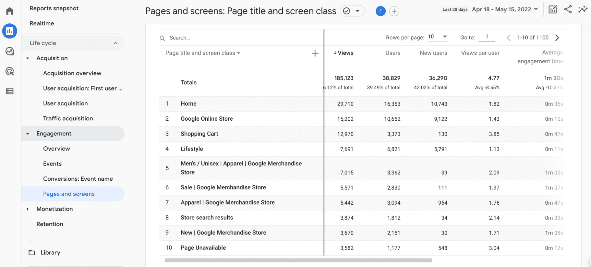 This is really useful for views like “Pages and Screens”, as it allows you to see which pages users are viewing organically and how they interact with your site on each page. This view can really help you understand which pages may need to be optimized for user experience.