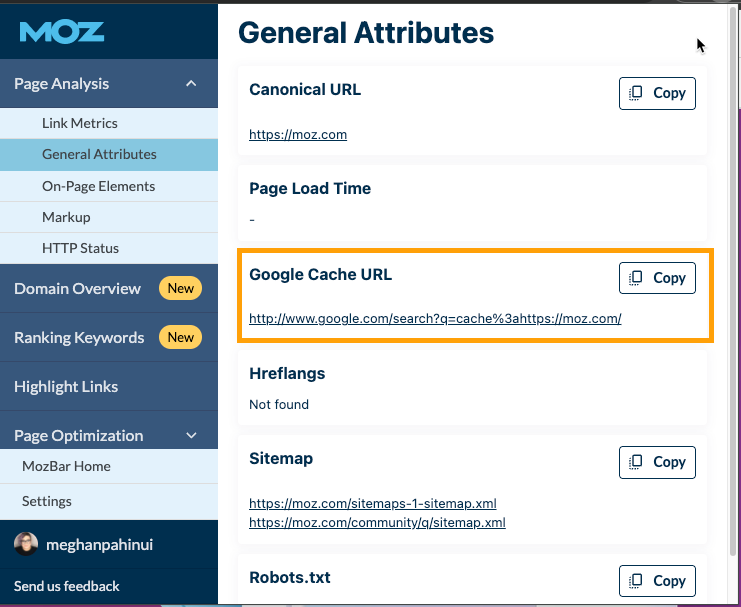 https://google.com/search?q=cache:https://example.com/If you can't remember the code, the MozBar contains a quick link to Google's cache. It's a good idea to keep the MozBar handy, as it can help with several other items in your audit.