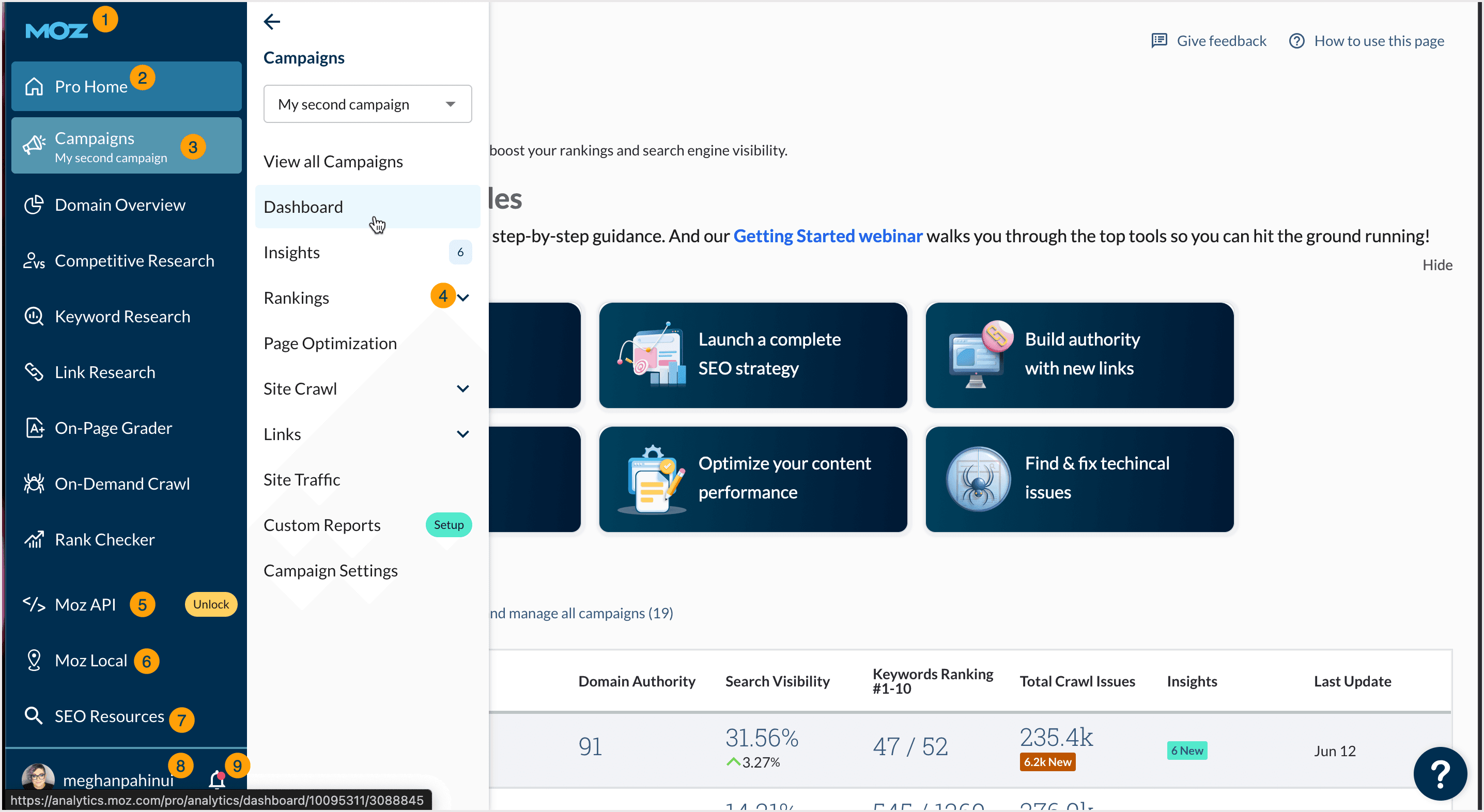 2. Moz Pro Home - Click the Pro Home button to be taken to your Pro-specific home page, which includes onboarding guides and Campaign previews.