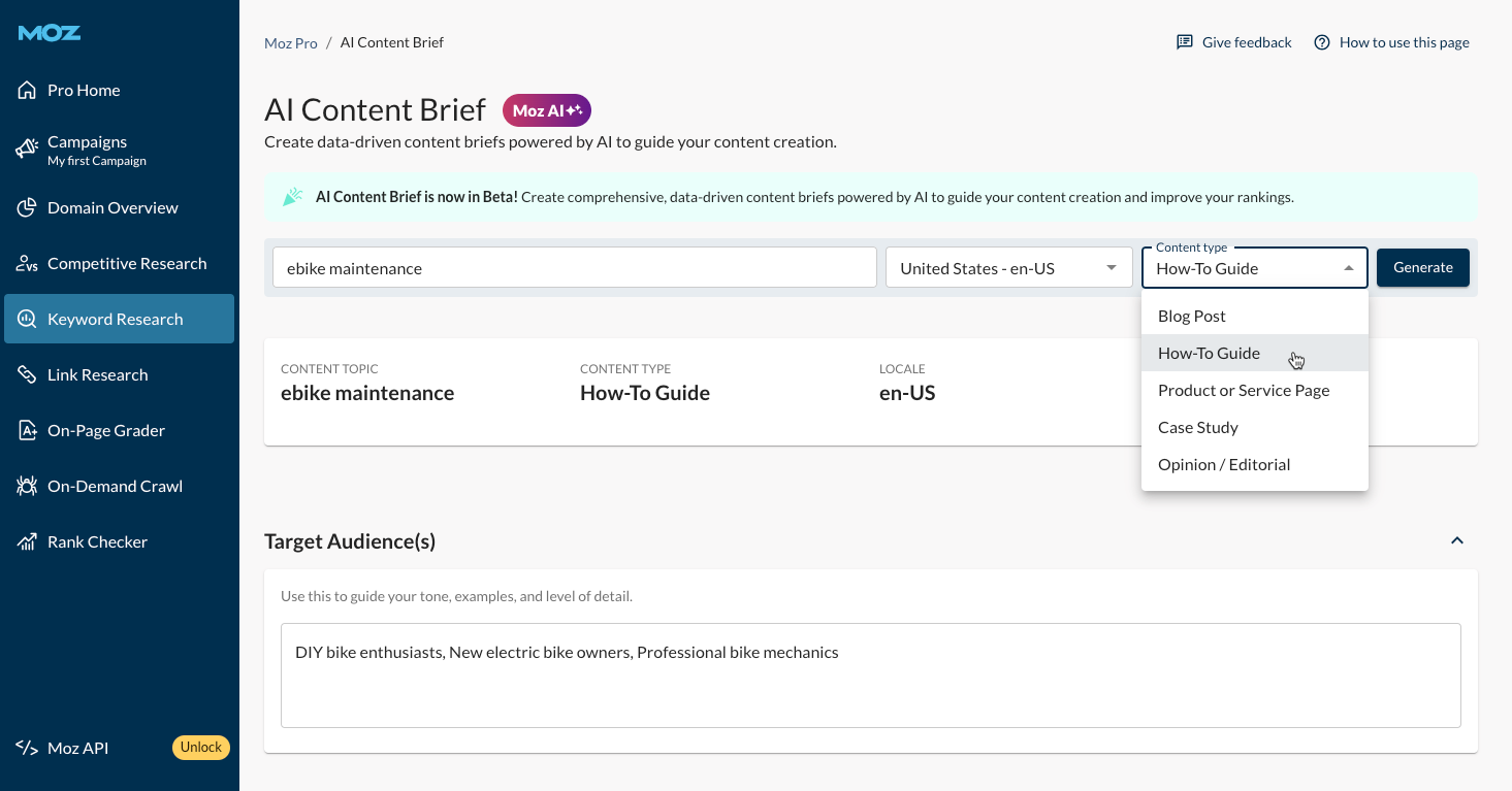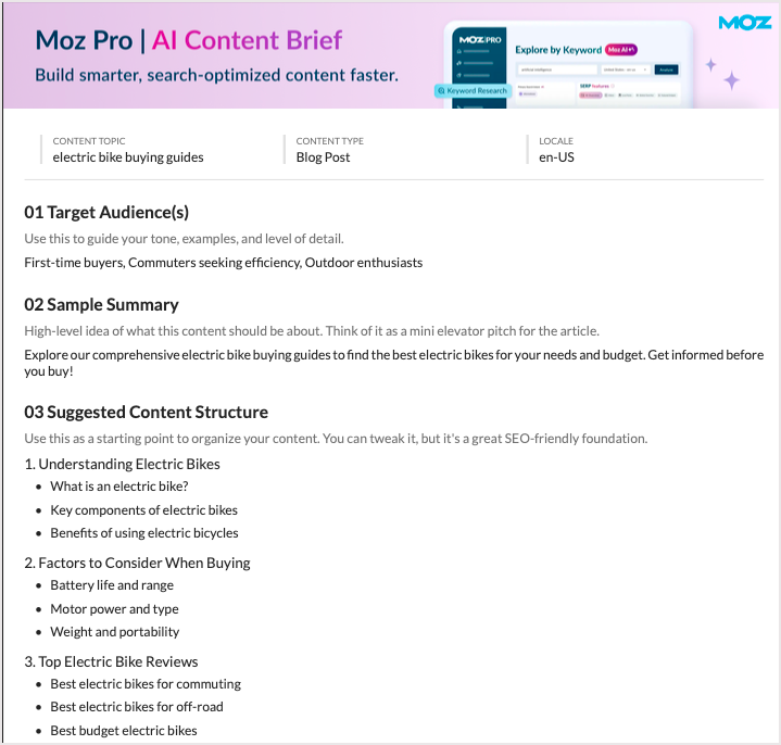We are excited to announce the release of our newest beta – AI Content Brief in the Keyword Research suite. This innovative feature is your shortcut from research to SEO-optimized content. By combining Moz’s industry-leading SEO data with AI-powered guidance, Moz Pro gives busy marketers a structured, confidence-boosting roadmap to publish content that ranks.