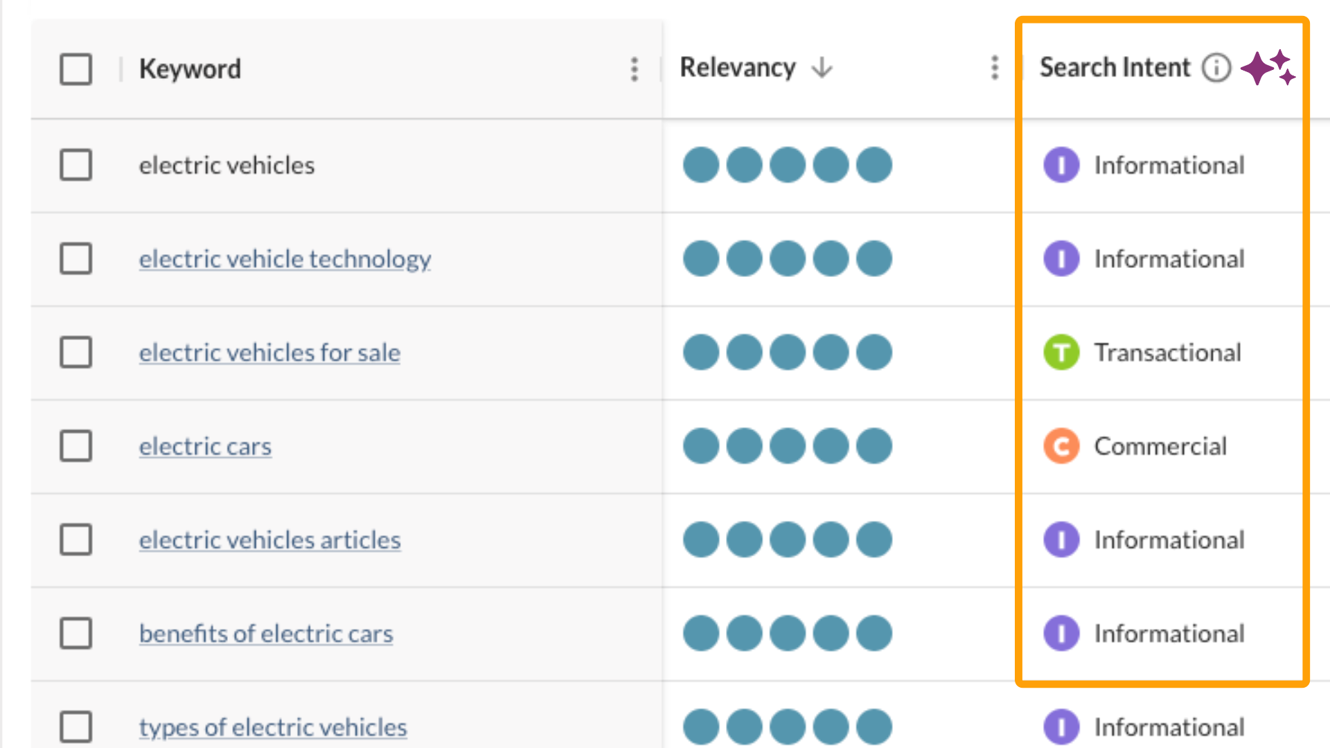 You’ll also see the Moz AI identifier next to Search Intent, in the Keyword Suggestions tool. This is a new data point that allows you to quickly see the dominant search intents — whether it be informational, commercial, transactional, or navigational — of any keyword, or indeed many keywords, at a glance.